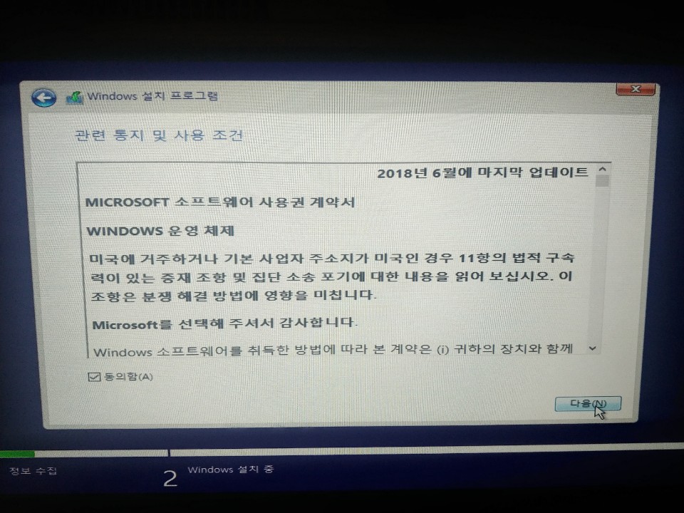 다음은 Windows 설치에 대한 동의입니다.