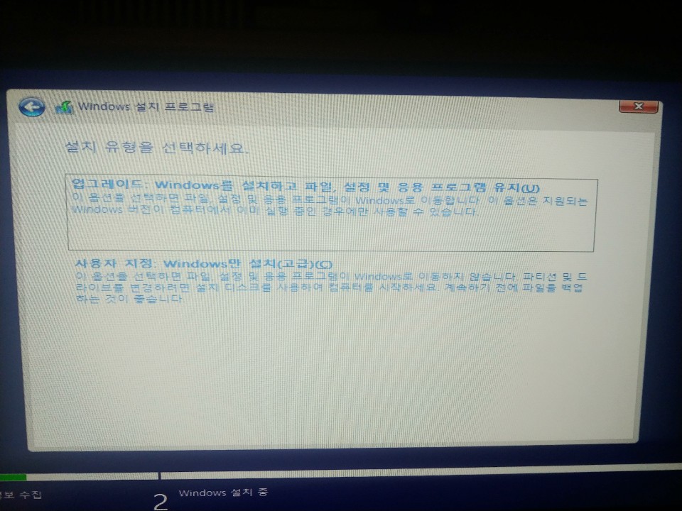 기존 Windows가 설치되어 있다면 위에 업그레이드를 선택하시고