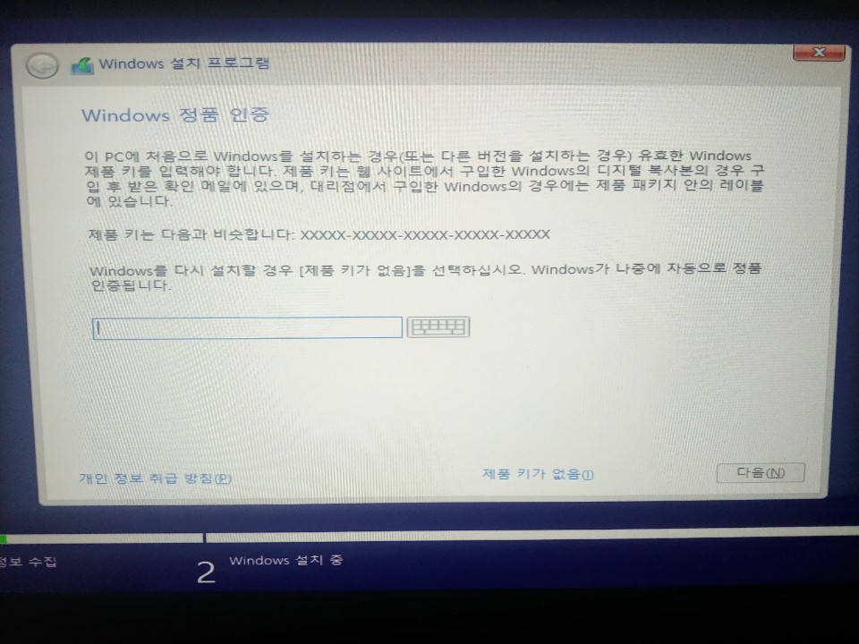 제품 키가 없으시다면 아래 제품 키가 없음을 눌러주시면 됩니다.