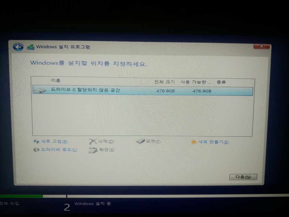 Windows를 처음 설치하신다면 할당되지 않은 공간을 선택 (전체 크기가 많은 것)